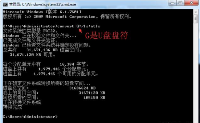 在弹出的窗口中输入“convert G: /fs:ntfs”(G为U盘盘符)回车,等待执行命令,转化完成。如图所示: